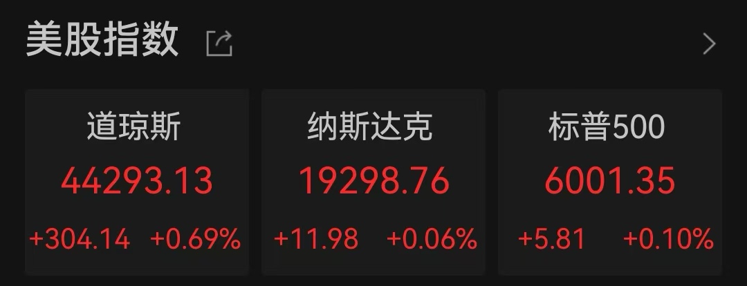 当地时间11月11日,美股三大股指小幅收涨,数据显示,截至收盘,道指涨0.69%报44293.13点,标普500指数涨0.1%报6001.35点,纳指涨0.06%报19298.76点,均续创历史新高。