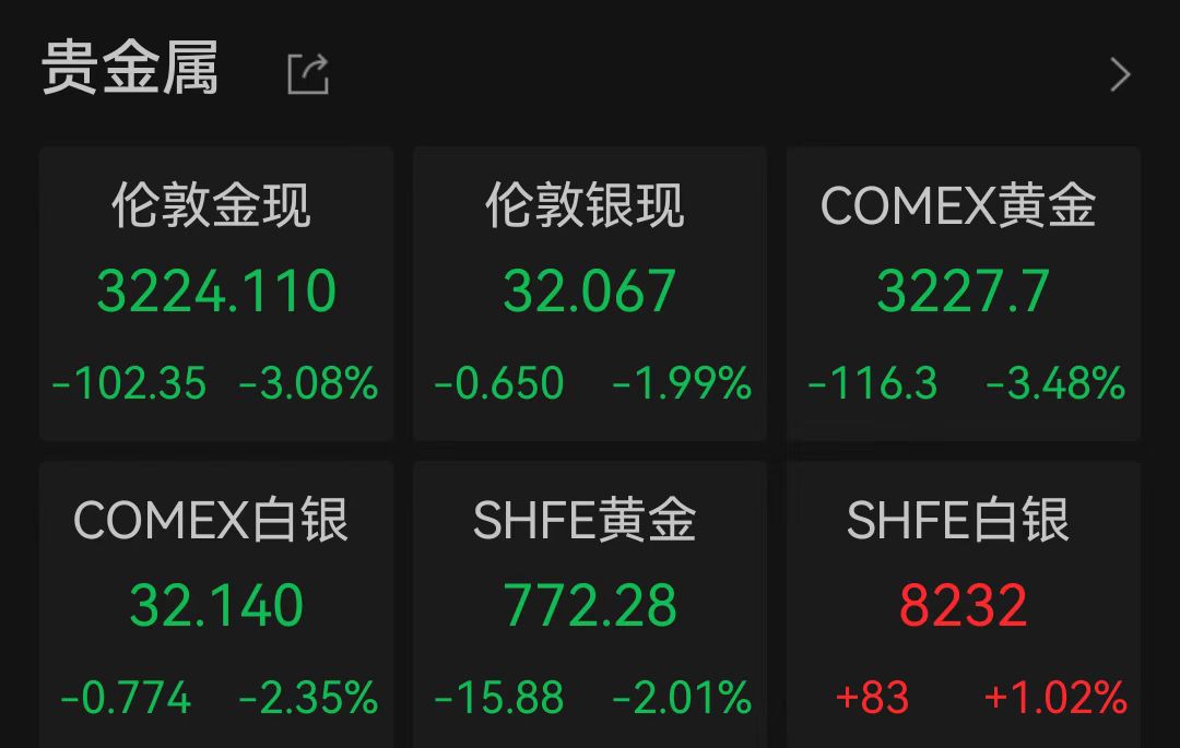 黄金跌超3%,伦敦金现报3224.11美元/盎司,COMEX黄金报3227.7美元/盎司。