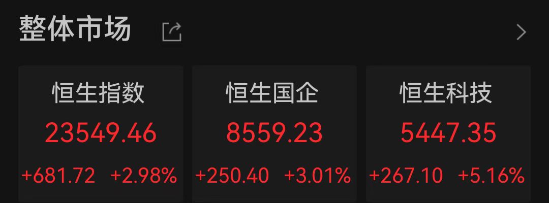 具体来看,恒生科技指数一度涨超6%,恒生指数、恒生国企指数也一度涨超3.5%。截至收盘,香港恒生指数涨2.98%,恒生国企指数涨3.01%,恒生科技指数涨5.16%。