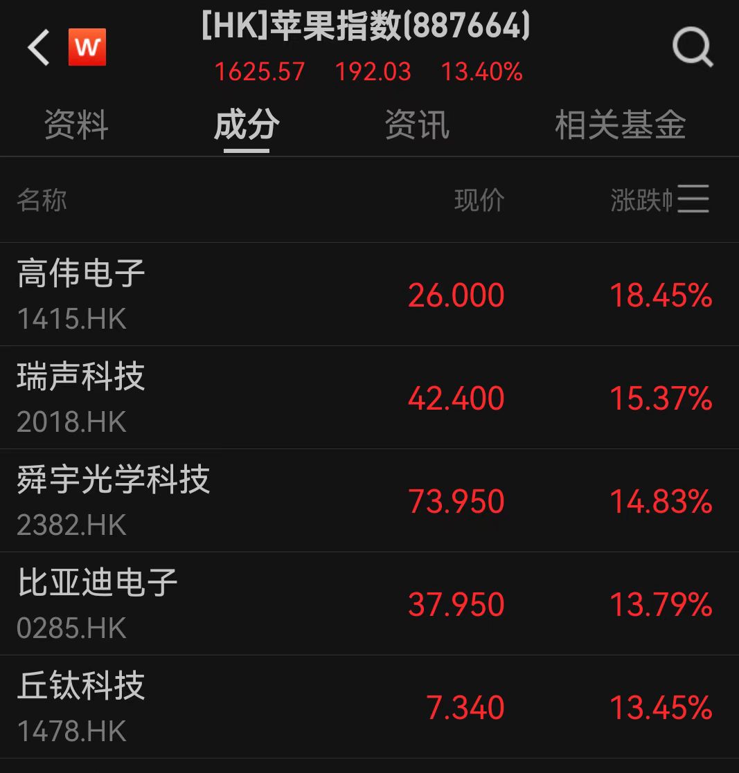 港股苹果指数也直线拉升,收涨13.40%。成分股份中高伟电子(01415.HK)涨超18%,瑞声科技(02018.HK)涨超15%,比亚迪电子(00285.HK)、舜宇光学科技(02382.HK)、丘钛科技(01478.HK)涨超13%。
