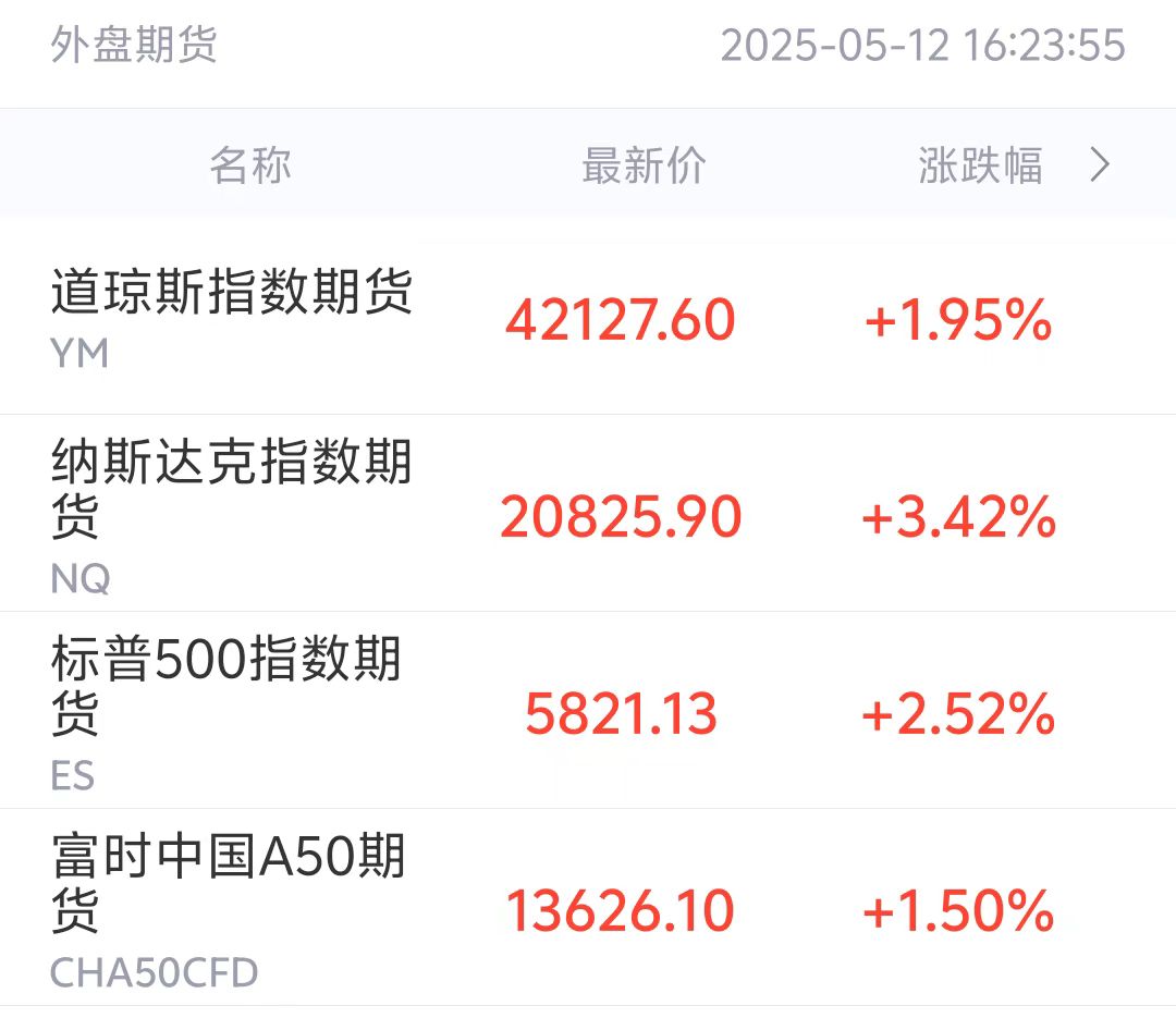 美股期货走高,纳指期货涨超3.4%,道指期货涨近2%,标普500指数期货也涨超2.5%。